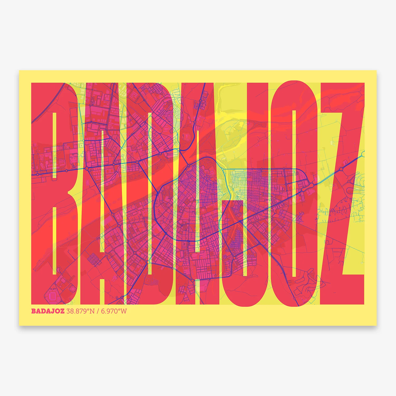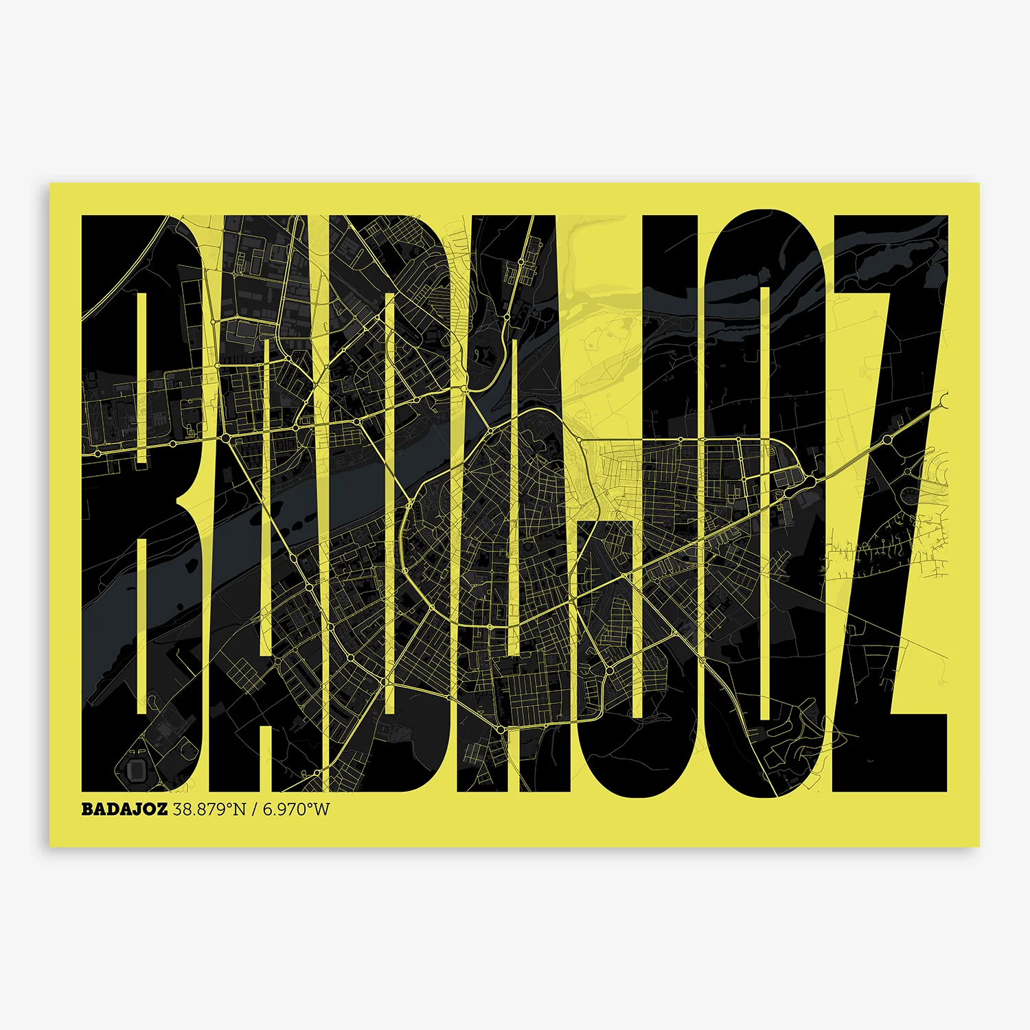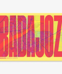 Personalize this Badajoz Poster V09, designed with a composition of the map of Badajoz and the letters of its full name. Perfect for decorating any corner of your home and taking a little piece of this city with you. A cool gift to decorate the walls of lovers of graphic design and typography.