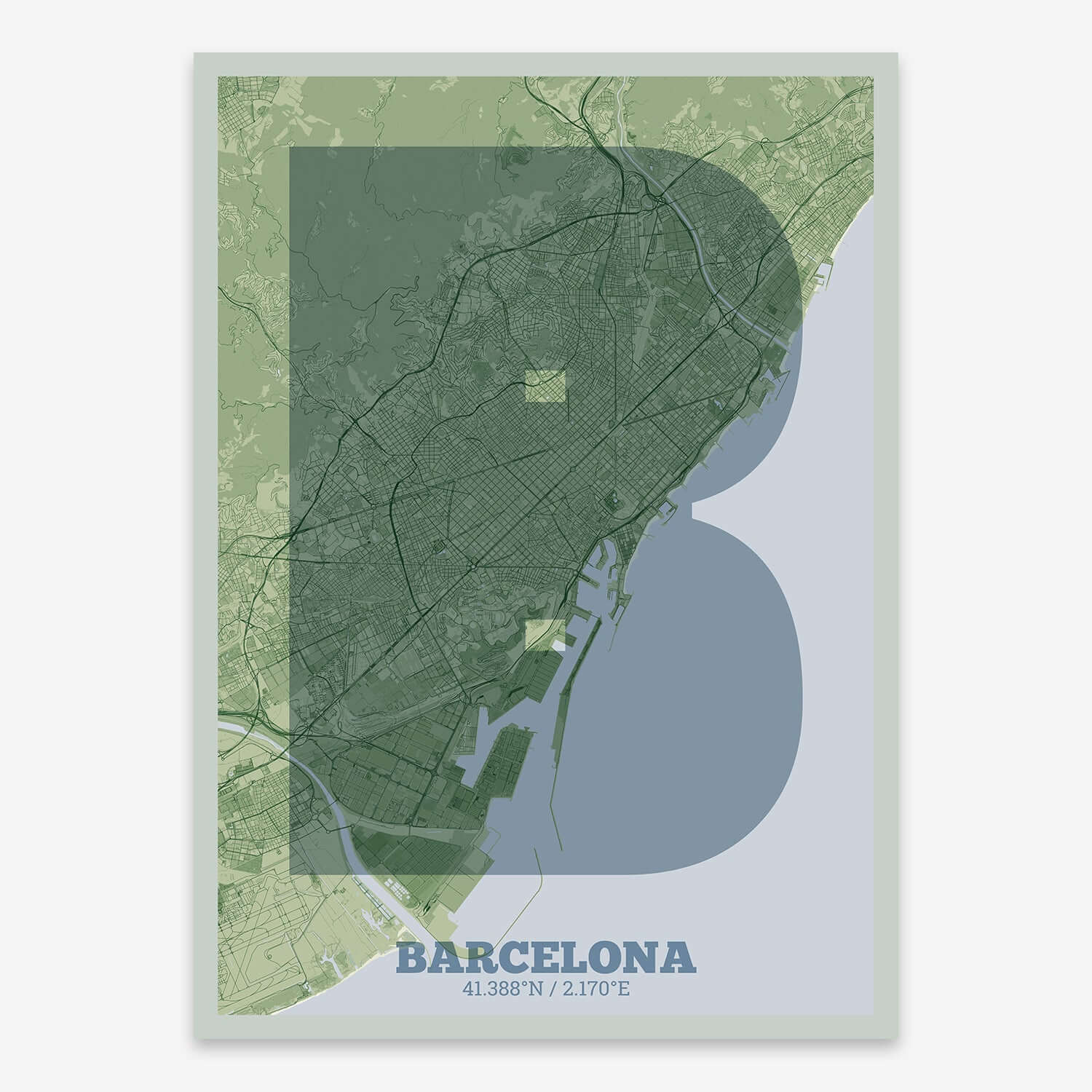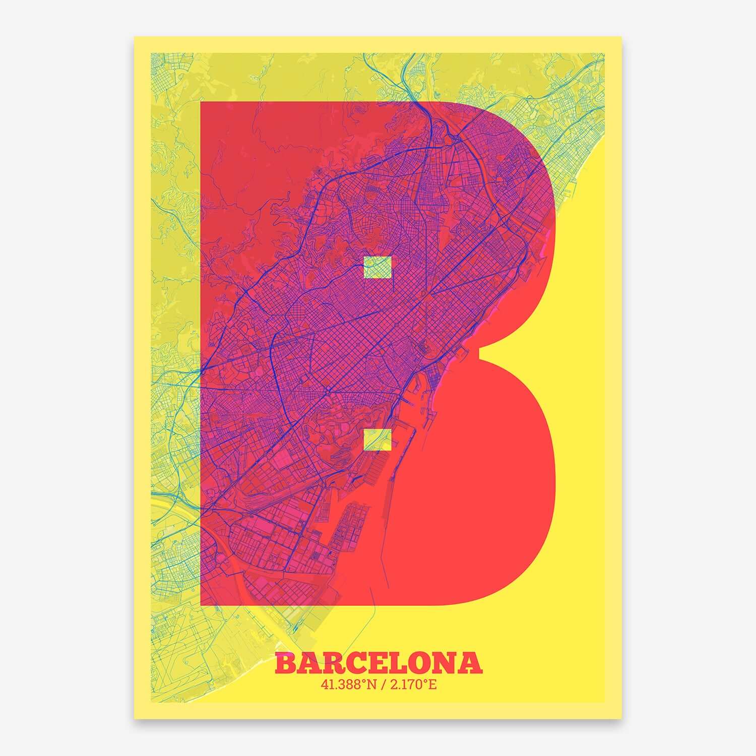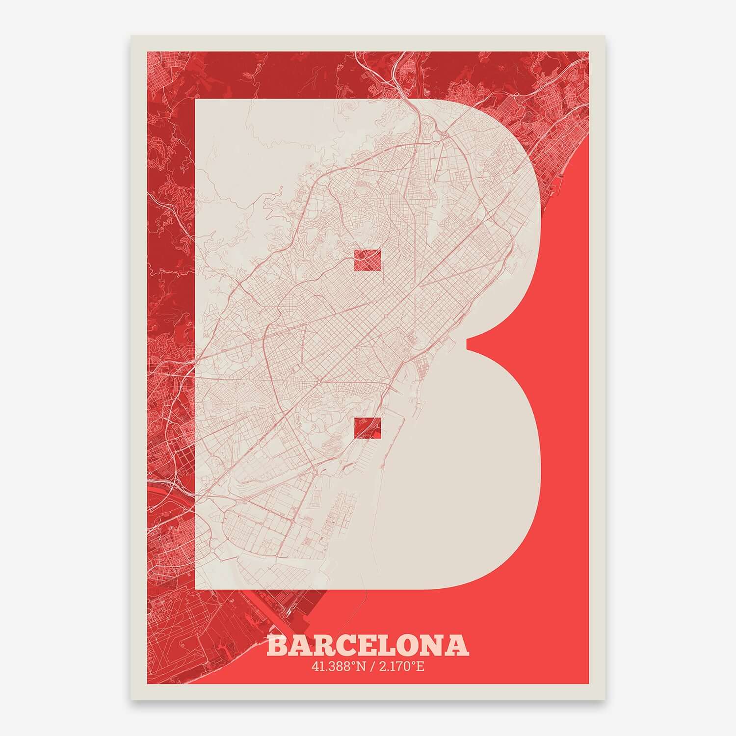 Personalize this Barcelona Poster V02, designed with a composition of the map of Barcelona and the letter B or purchase it with this graphic design ready to add to your cart. A special gift to decorate the walls of lovers of graphic design and typography.