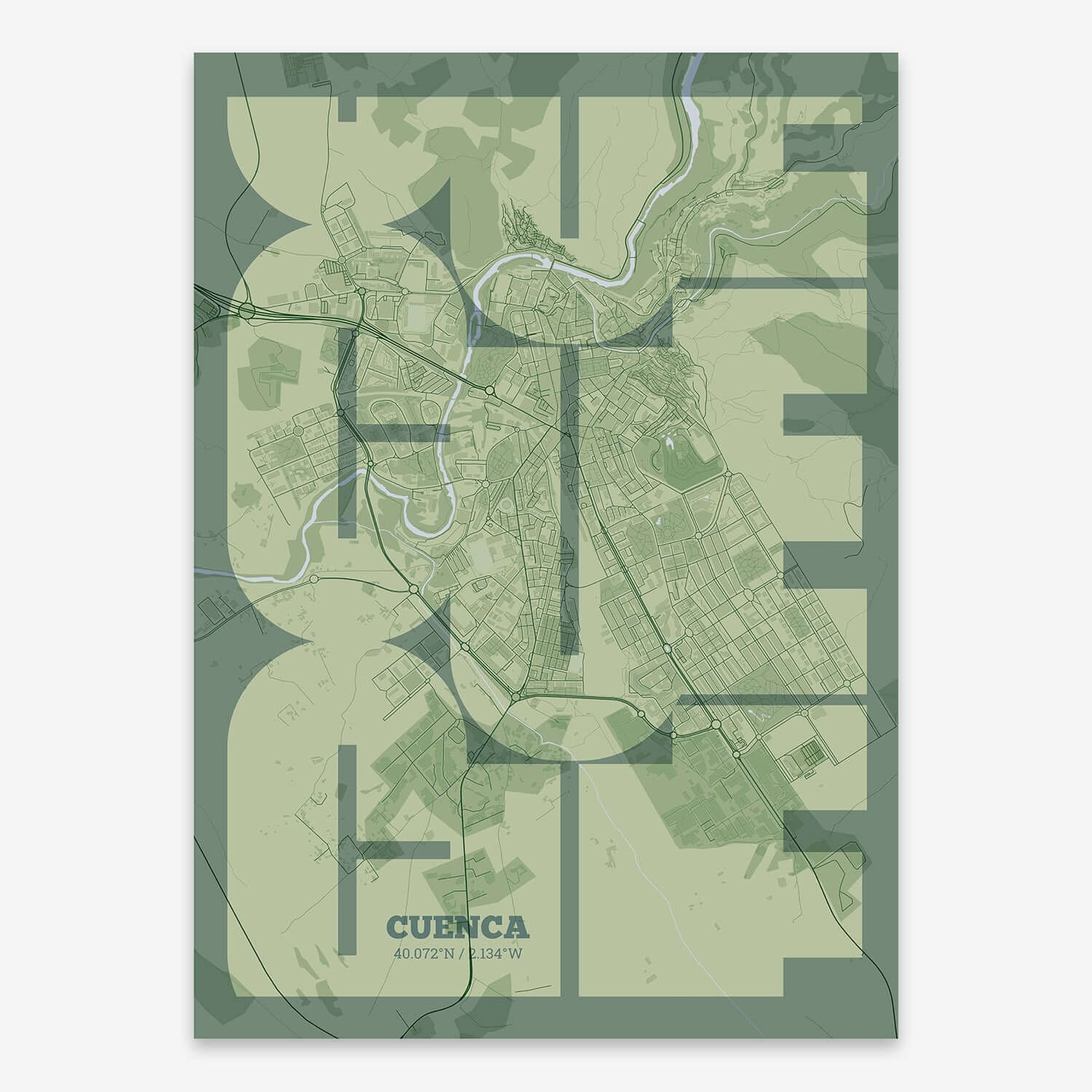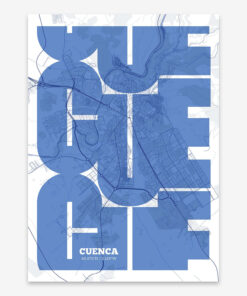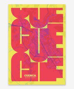 Personalize this Cuenca Poster V03, designed with a composition of the map of Cuenca and the letters CUE or purchase it with this graphic design ready to add to your cart. A special gift to decorate the walls of lovers of graphic design and typography.