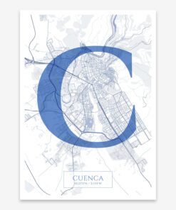 Personalize this Cuenca Poster V06, designed with a composition of the map of Cuenca and the letter C or purchase it with this graphic design ready to add to your cart. A special gift to decorate the walls of lovers of graphic design and typography.
