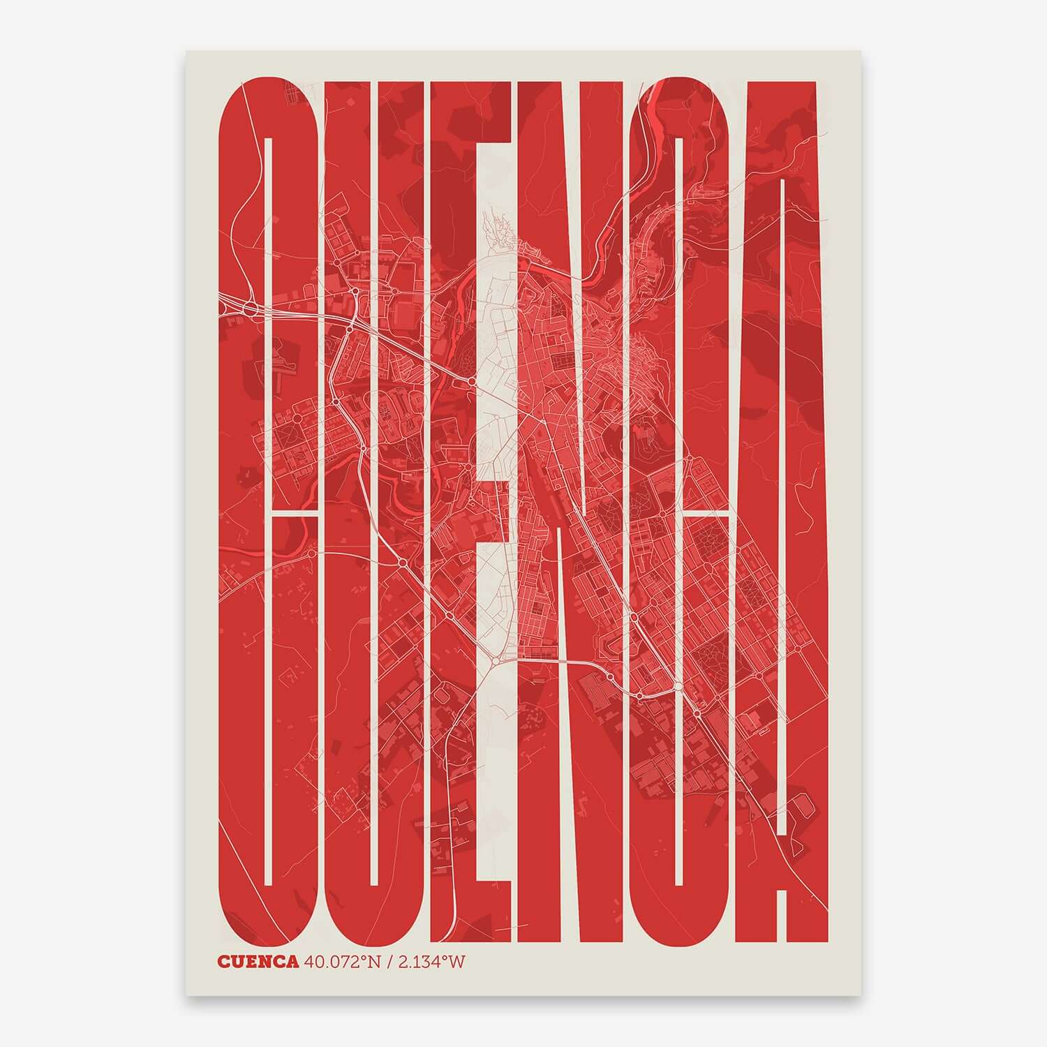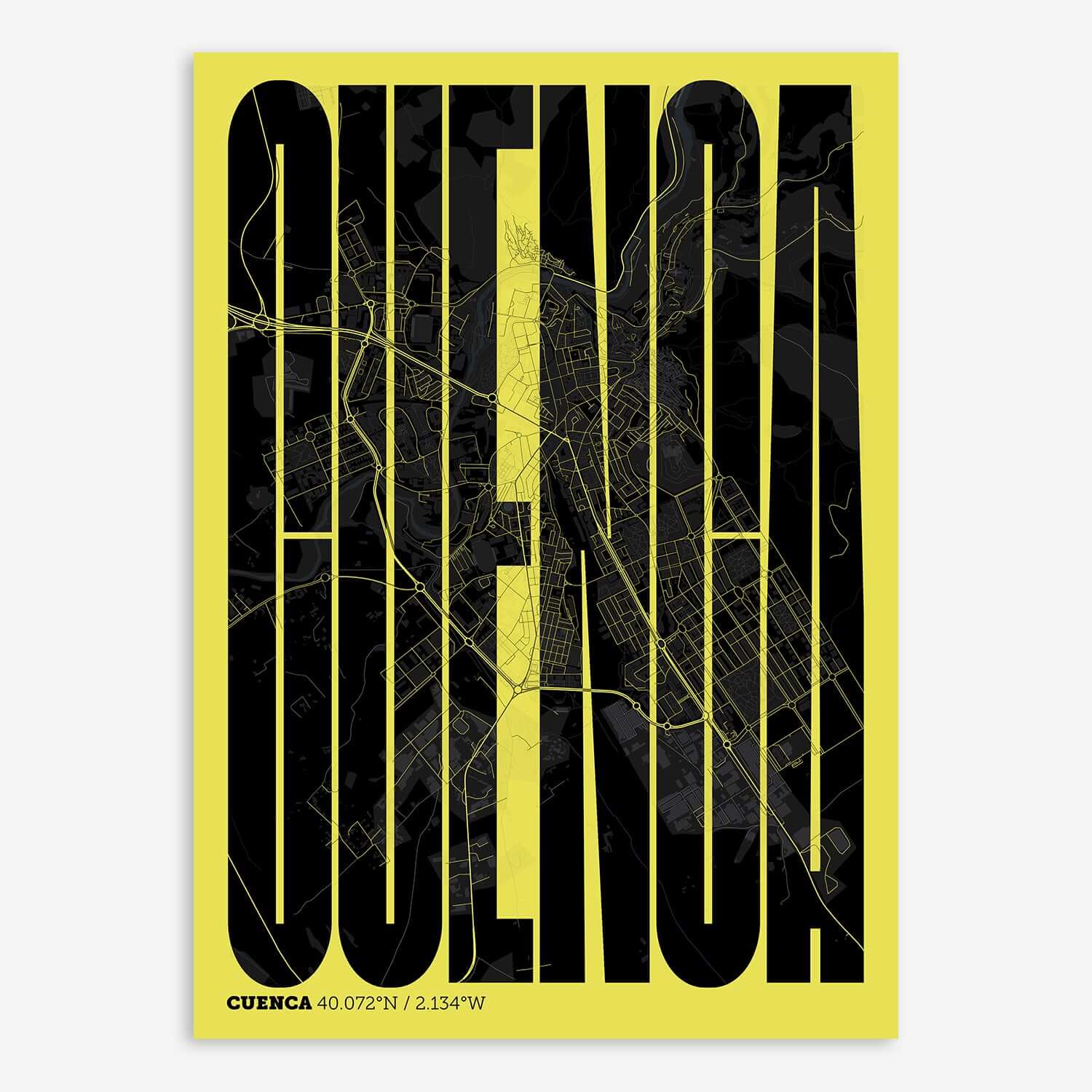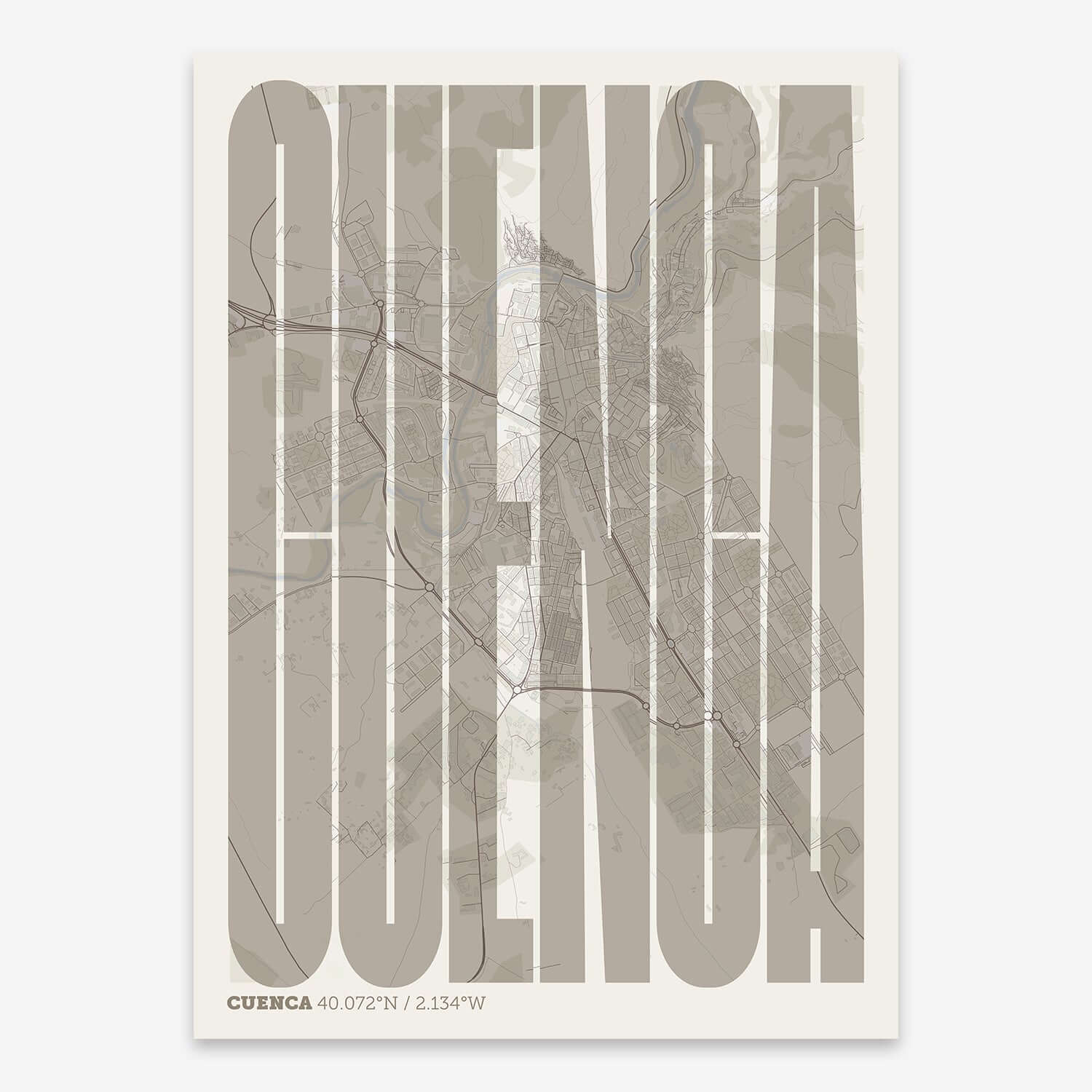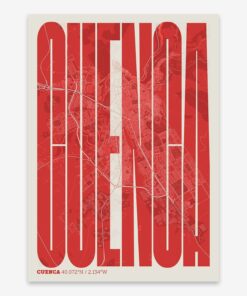Personalize this Cuenca Poster V09, designed with a composition of the map of Cuenca and the letters of its full name. Perfect for decorating any corner of your home and taking a little piece of this city with you. A cool gift to decorate the walls of lovers of graphic design and typography.