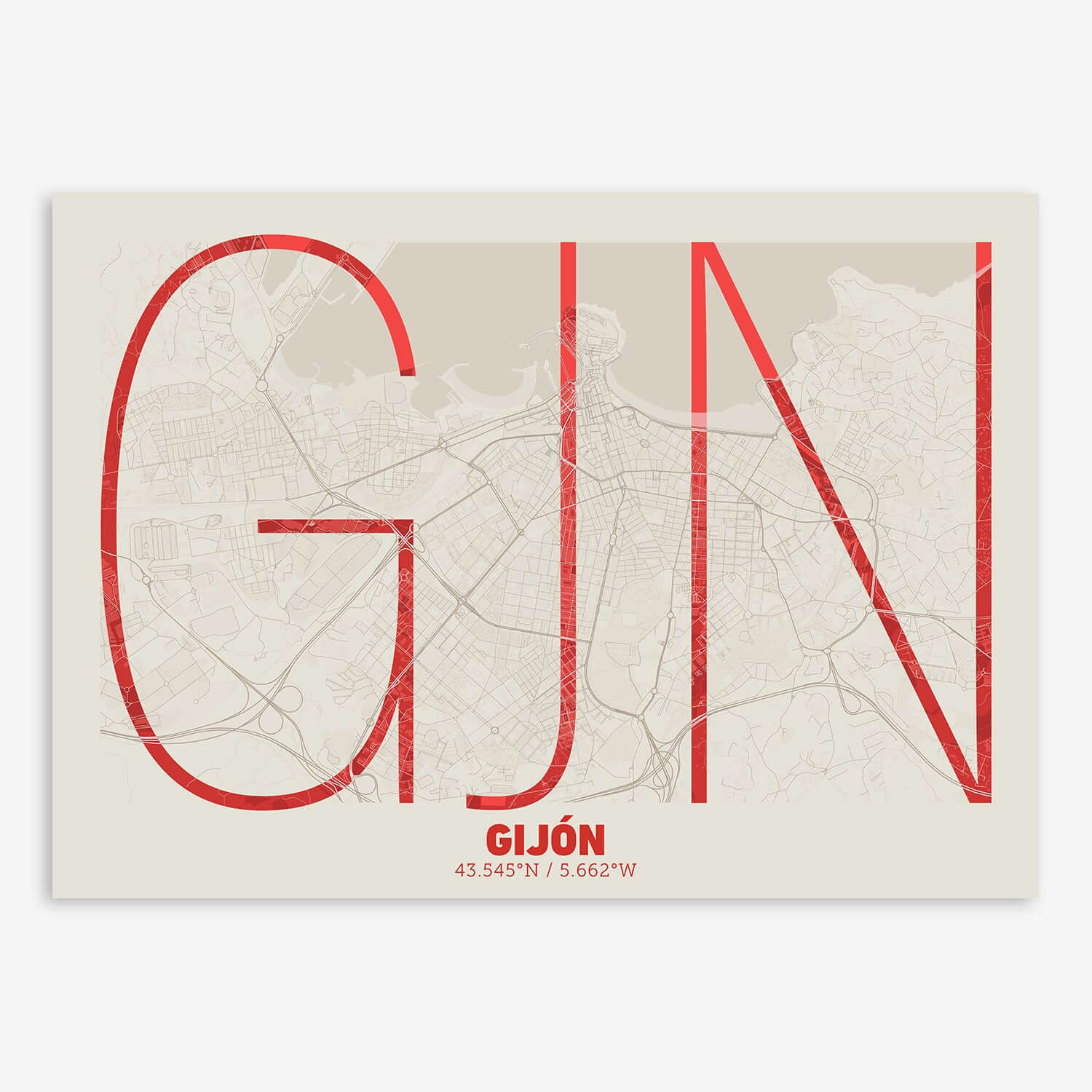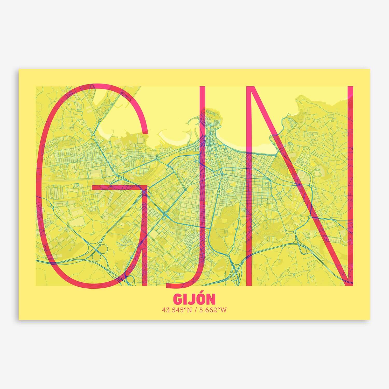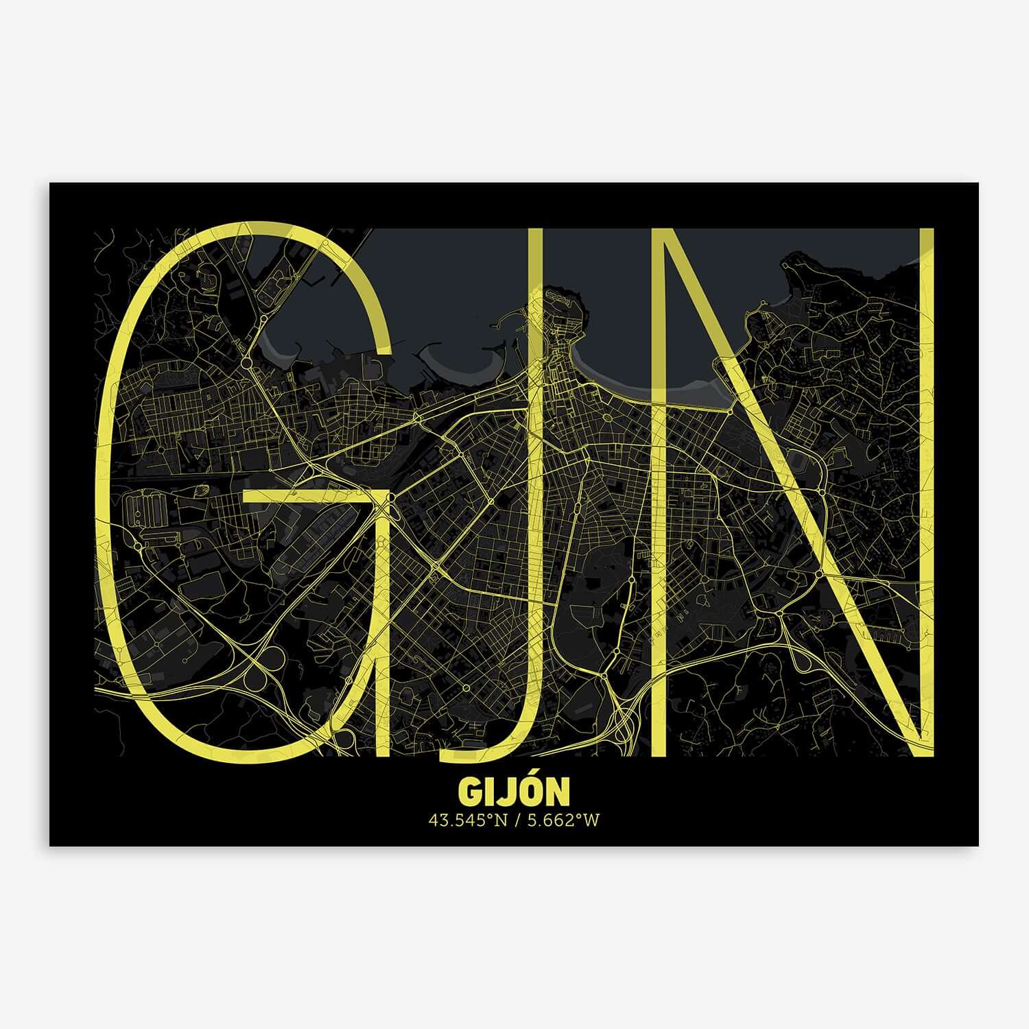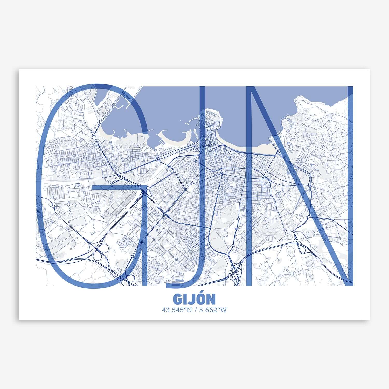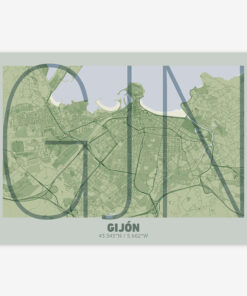 Personalize this Gijon Poster V07, designed with a composition of the map of Gijon and the letters GJN or purchase it with this graphic design ready to add to your cart. A special gift to decorate the walls of lovers of graphic design and typography. Customize it with your own texts if you want to change them.