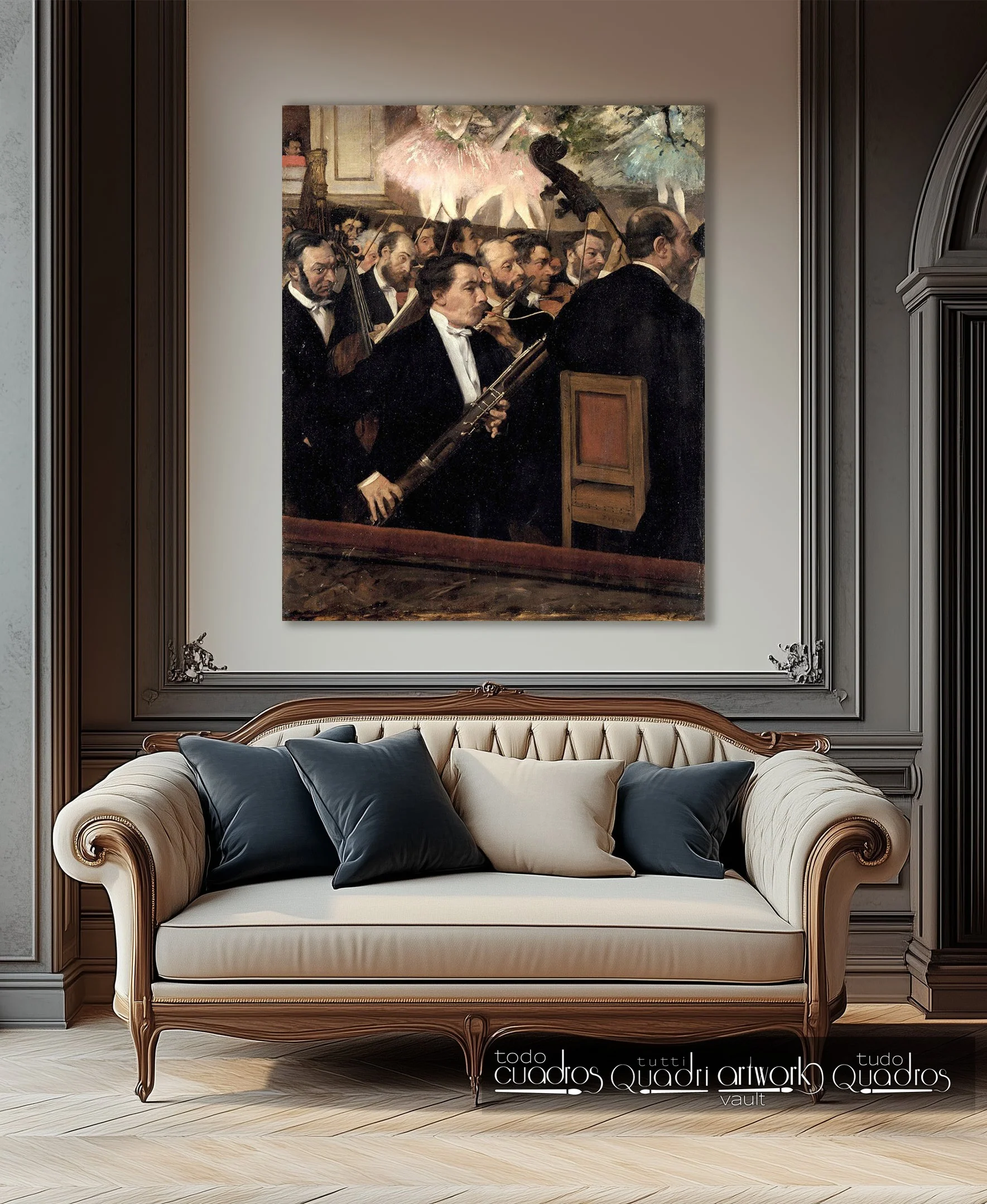 En la parte alta, como ángeles, se alcanzan a ver los tutús resplandecientes y en movimiento, por otra parte, todos los demás integrantes de la orquesta tienen una expresión ligeramente pusilánime y además todos tocan el mismo tipo de instrumento, todo ello exalta con mucha fuerza la figura central y protagonista de la obra.