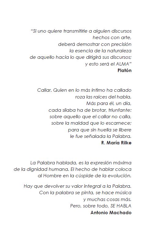 “He aquí un libro sobre la Palabra Olvidada, tan necesaria de recuperar. Pilar Altamira haciendo honor a un apellido de alta alcurnia en nuestra cultura, somete a honda reflexión el misterio del habla. Según mantiene en este libro la Palabra no es sino una expresión completa del ser humano indiscernible del “gesto”, de las “emociones” y los “sentimientos” que lo acompañan. Desorientados por las nuevas tecnologías hemos olvidado que la Palabra hablada define al ser humano en su naturaleza intransferible e inviolable. La autora insiste en la relación metafísica entre la palabra y el silencio; y en otra relación mediadora entre ambos como es la escucha”. JOSE LUIS ABELLÁN. Ensayista. Autor de la magnífica “Historia de la Filosofía y las Ideas”. Premio Nacional de Ensayo 1981