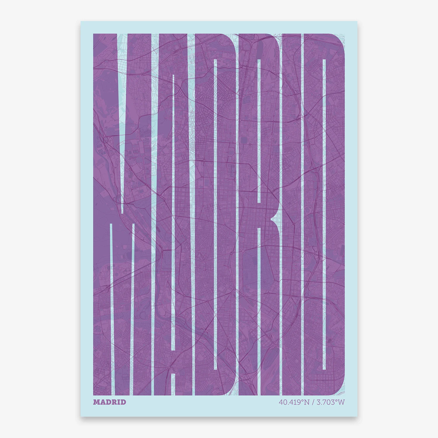 Personalize this Madrid Poster V09, designed with a composition of the map of Madrid and the letters of its full name. Perfect for decorating any corner of your home and taking a little piece of this city with you. A cool gift to decorate the walls of lovers of graphic design and typography.