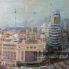 Este óleo inspirado en el estilo de Vincent van Gogh, presenta una vista nocturna en la Gran Vía de Madrid. Los trazos gruesos, enérgicos, cortos y curvos de la pintura, conforman una pieza que fusiona lo clásico y lo moderno en una escena urbana contemporánea.