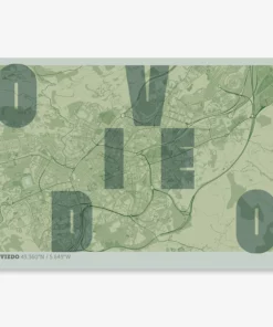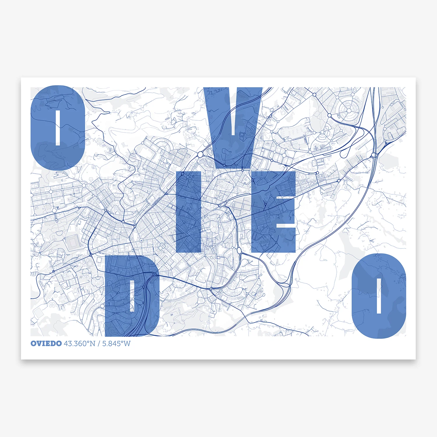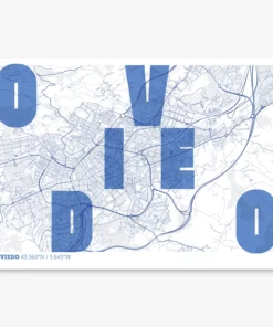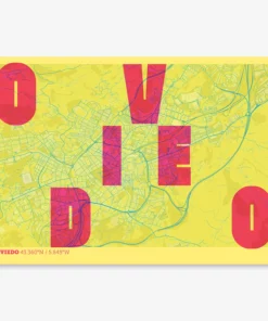 Personalize this Oviedo Poster V08, designed with a composition of the map of Oviedo and the letters of its full name. Perfect for decorating any corner of your home and taking a little piece of this city with you. A cool gift to decorate the walls of lovers of graphic design and typography.