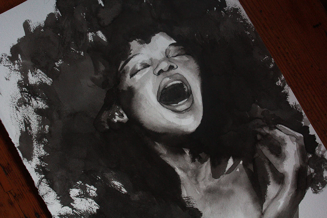Lámina pintada en tinta china. La serie Black nos habla de doce espíritus felinos que se manifiestan en forma de mujer dando voz a la belleza negra.